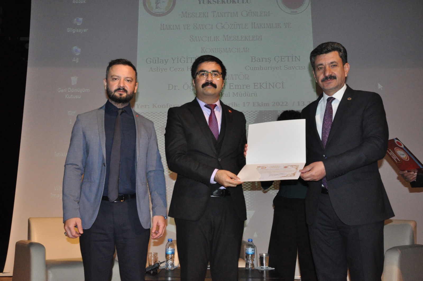 Dr. Öğretim Üyesi Emre Ekinci’nin moderatörlüğünde gerçekleşen konferansta Asliye Ceza Hakimi Gülay Yiğitürk ve Cumhuriyet Savcısı Barış Çetin ‘Hakim ve Savcı gözünden hâkimlik ve savcılık mesleği’ meslek hayatlarına ulaşmalarında yaşadıkları sıkıntılar, çalışma ortamları, üniversite eğitiminin önemi ile ilgili öğrencilere çeşitli bilgi verdiler.