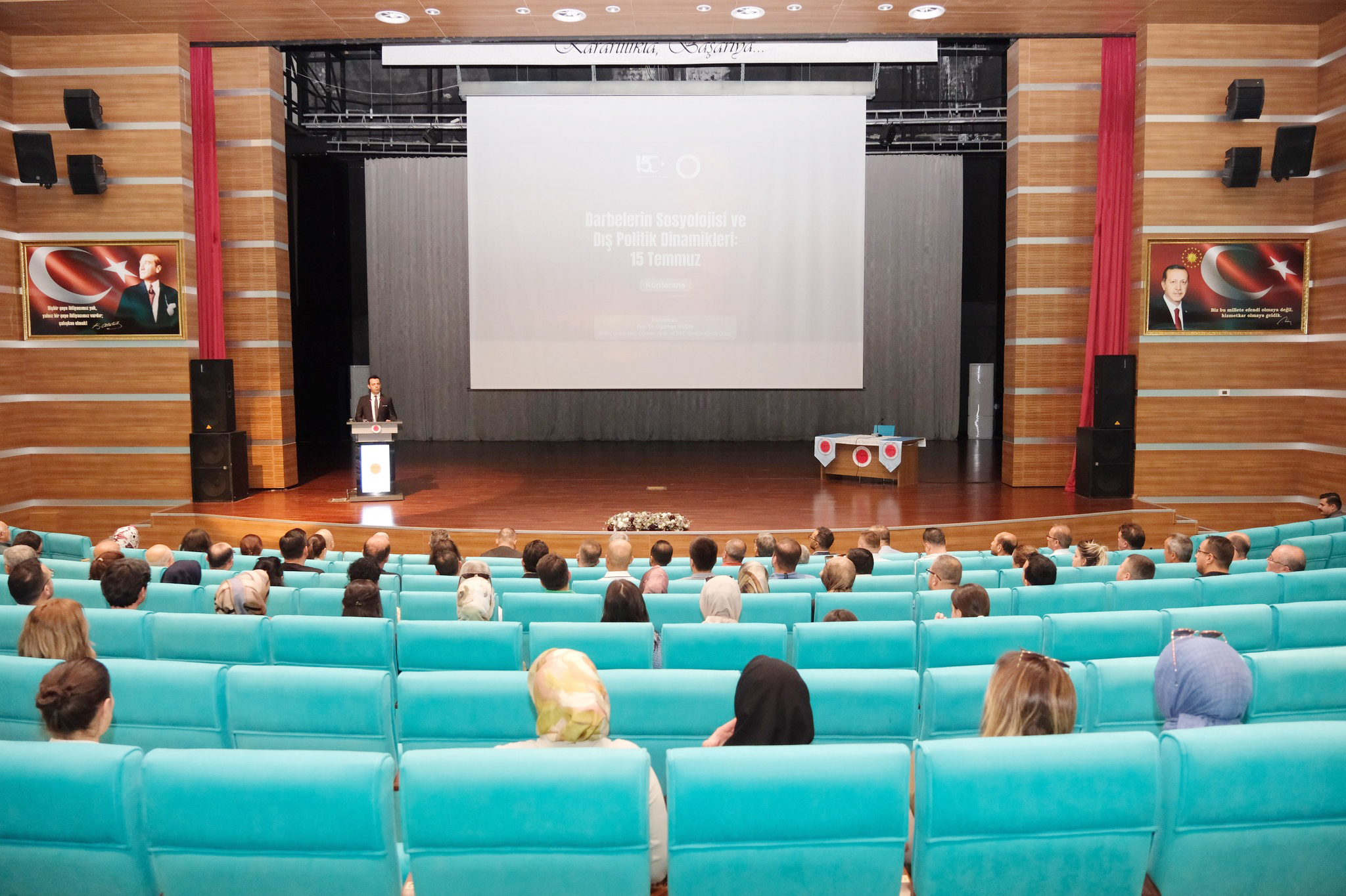 Konuşmacı Doç. Dr. Oğuzhan Bilgin, tarihsel süreçte darbelerin sosyolojik boyutlarını kapsamlı biçimde analiz ederken, 15 Temmuz’un Türk milletinin eşsiz direnişiyle nasıl engellendiğine ve bu mücadelenin uluslararası politika dinamiklerine yansımalarına dikkat çekti.