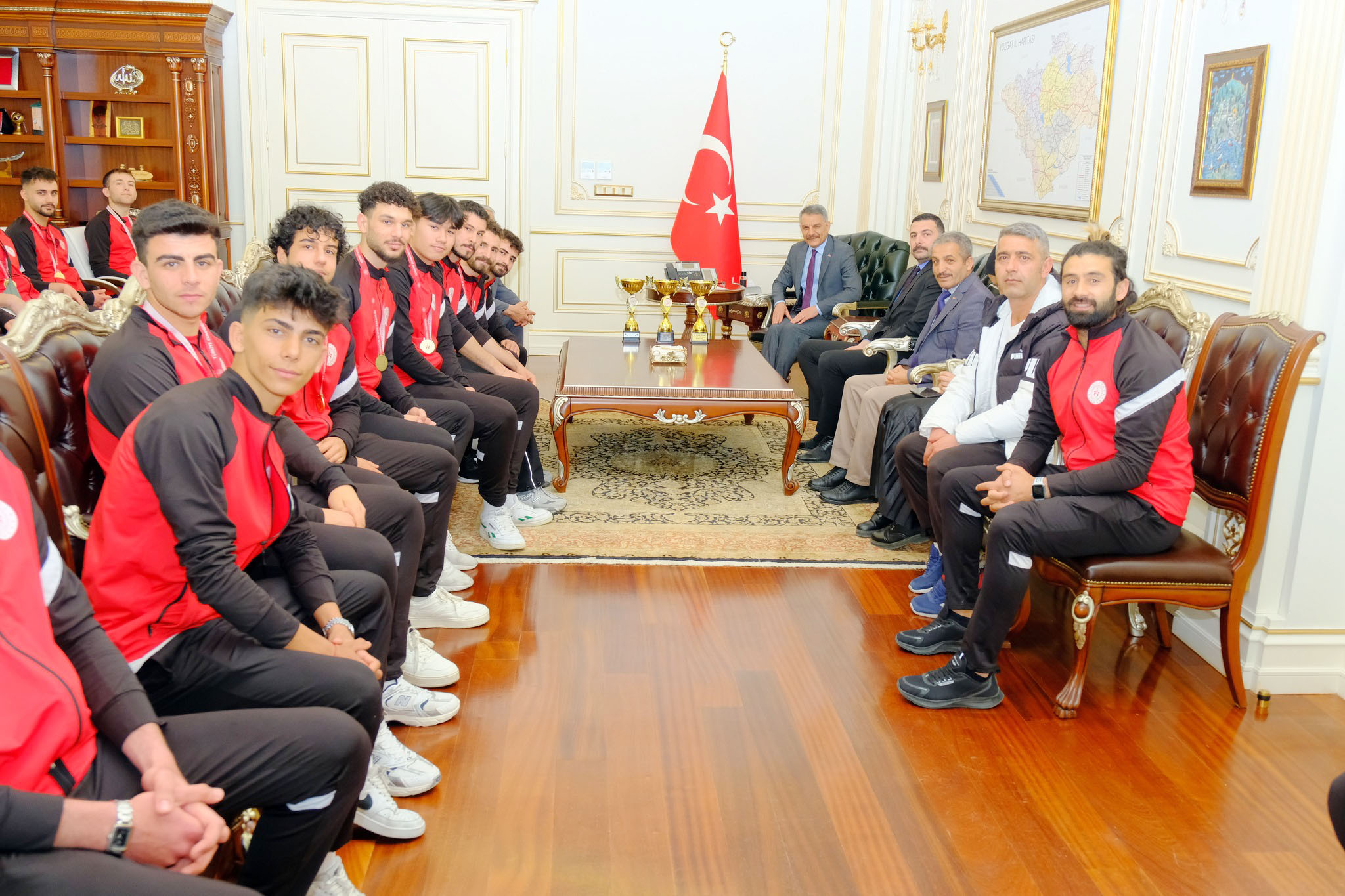 Yozgat Valisi Mehmet Ali Özkan, Kredi ve Yurtlar Spor Olimpiyatları’nda başarılı sonuçlar elde eden antrenörleri ve sporcuları makamında ağırladı.