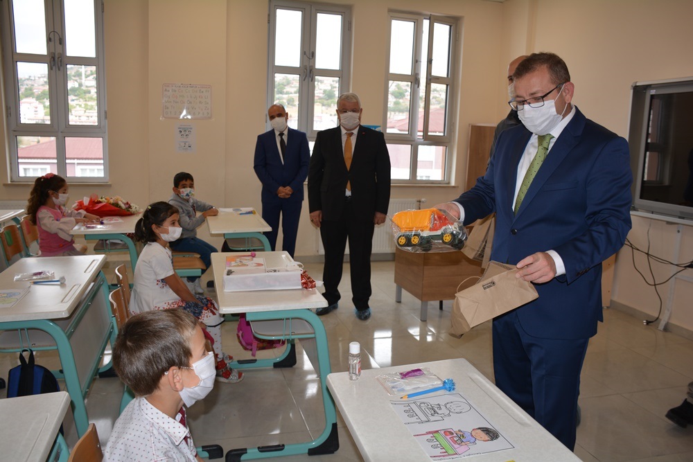 Vali Ziya Polat, Atatürk İlkokulu’nda eğitime başlayan minikleri ziyaret ederek, minik öğrencilere maske ve çeşitli hediyeler verdi.