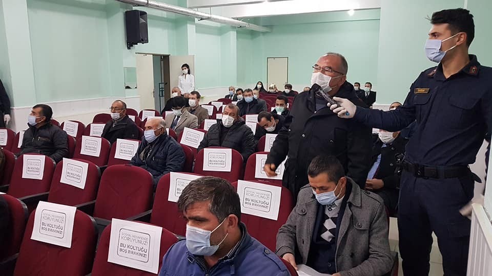 Yozgat’ın Yenifakılı ilçesinde korona virüs tedbirlerine uyularak yapılan muhtarlar toplantısına katılan Yozgat Valisi Ziya Polat, muhtarların sorunlarıyla ilgili bilgiler aldı.