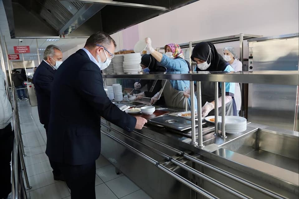 Sıraya girerek yemeğini kendisi alan Vali Polat, öğrencilerin masasına konuk oldu. Öğrencilerle sohbet eden Vali Polat, sorun ve isteklerini dinledi.