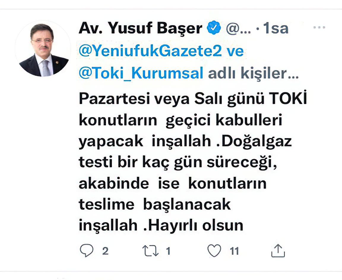 Milletvekili Başer açıklamasında şu ifadeleri kullandı; “Pazartesi veya Salı günü TOKİ konutların geçici kabulleri yapılacak inşallah. Doğalgaz testi bir kaç gün süreceği, akabinde ise konutların teslime başlanacak inşallah. Hayırlı olsun.”