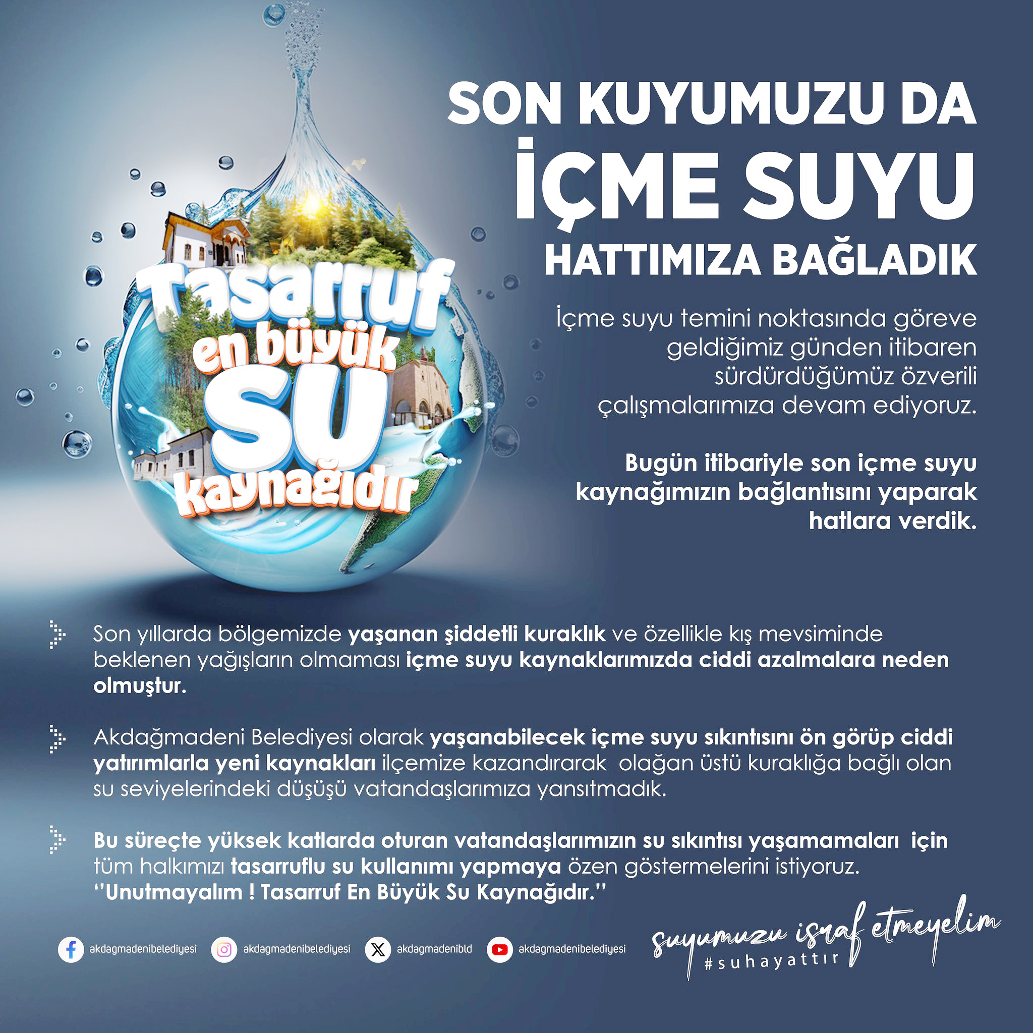 Akdağmadeni Belediye Başkanı Dr. Nezih Yalçın, içme suyu temini konusundaki özverili çalışmalarını sürdürdüklerini ve bu kapsamda son içme suyu kaynağının bağlantısını yaparak sistemlere dahil ettiklerini söyledi.