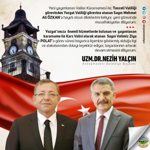 Akdağmadeni Belediye Başkanı Nezih Yalçın, Yozgat Valisi olarak atanan Vali Mehmet Ali Özkan’a hayırlı olsun derken, Kars Valisi olarak ataması yapılan Yozgat Valisi Ziya Polat’a da teşekkür etti.