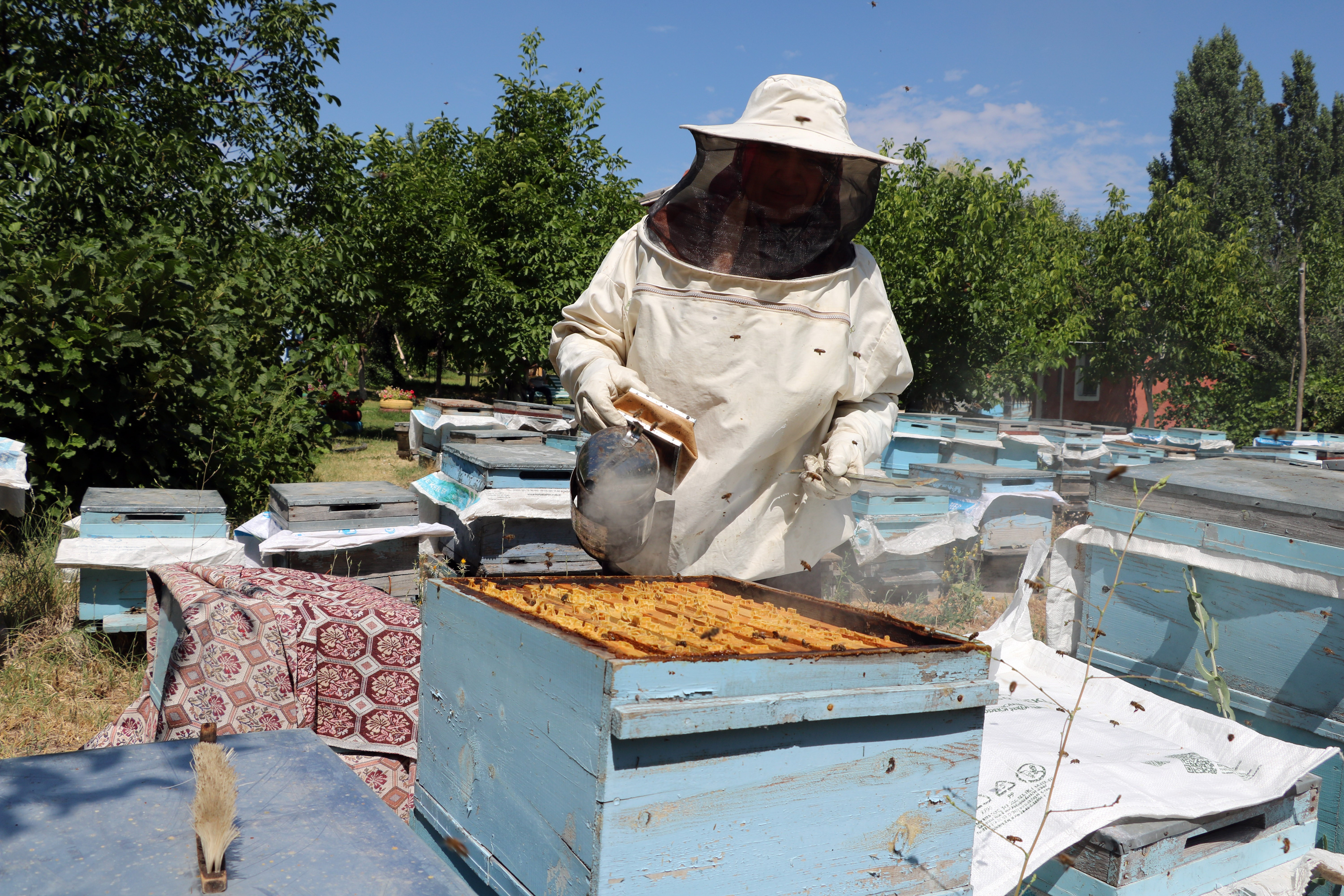 Yozgat’ın Sorgun ilçesine bağlı Aşağıcumafakılı köyünde yaşayan ev hanımı ve 4 çocuk annesi 49 yaşındaki İhsaniye Arslan da, 3 kovan arıyı 200 kovana çıkartarak yılda 1.5 ton bal üretiyor. Günlük ev işlerini yaptıktan sonra kovanların bulunduğu bölgeye giden Arslan, gün boyunca özel giysilerini giyerek arı ve kovanların bakımını yapıyor.