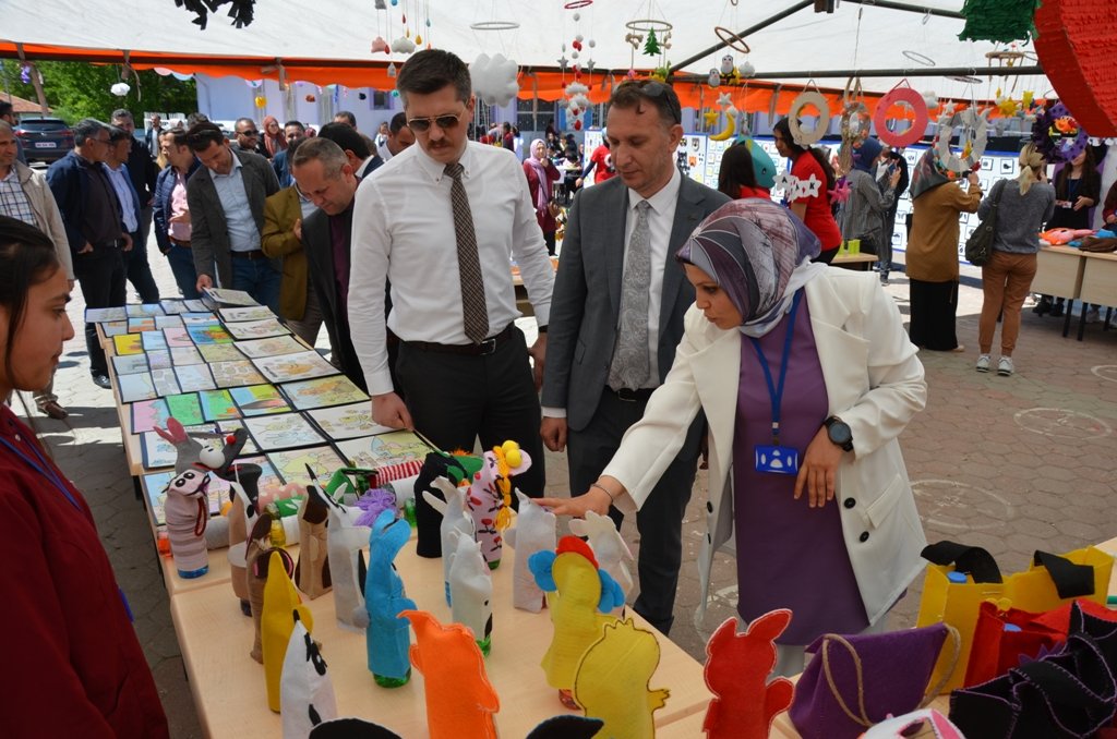 Serginin açılışı yapan Kaymakam Samet Serin ve beraberinde protokol üyeleri stantları gezerek Çocuk Gelişimi ve Eğitimi Öğretmeninden ürünler hakkında bilgi aldı.