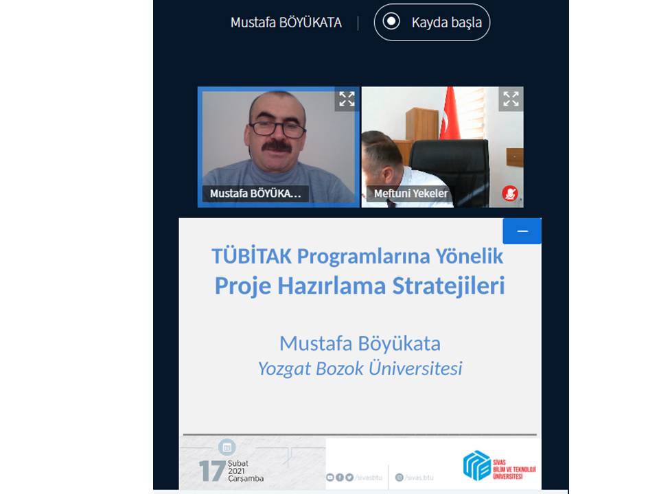 Yozgat Bozok Üniversitesi Öğretim Üyesi Prof. Dr. Mustafa Böyükata, Sivas Bilim ve Teknoloji Üniversitesi Rektörlüğü’nce akademisyenlere yönelik olarak 17 Şubat 2021 Çarşamba günü düzenlenen toplantıda, “TÜBİTAK Programlarına Yönelik Proje Hazırlama Stratejileri” konulu seminer verdi, bilgi ve önerilerini paylaştı.