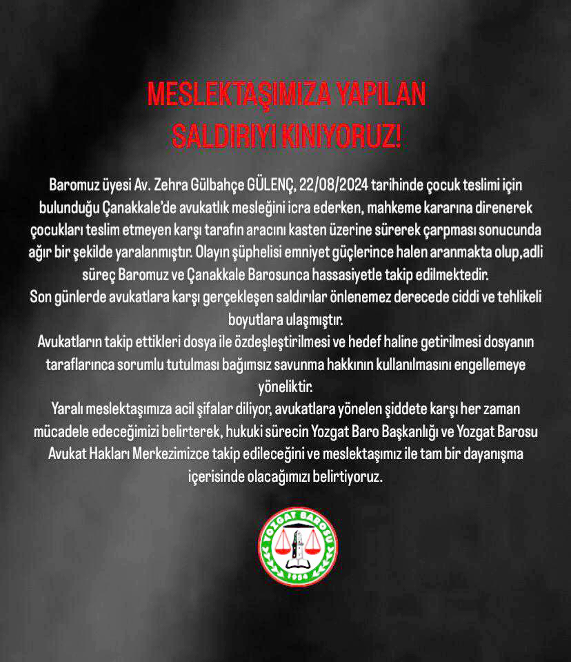 Yozgat Baro Başkanı Muhsin Ayanoğlu, Yozgat Barosu üyesi Av. Zehra Gülbahçe Gülenç’in Çanakkale’de çocuk teslimi için görevini yaparken maruz kaldığı saldırıya dair sert bir açıklama yaptı.