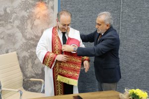 Konuşmaların ardından Prof. Dr. Ahmet Karadağ, Üniversite Rektörü Prof. Dr. Evren Yaşar’a Üniversite rektörlük cübbesini giydirerek çiçek ve hediye takdiminde bulundu. Haber Merkezi