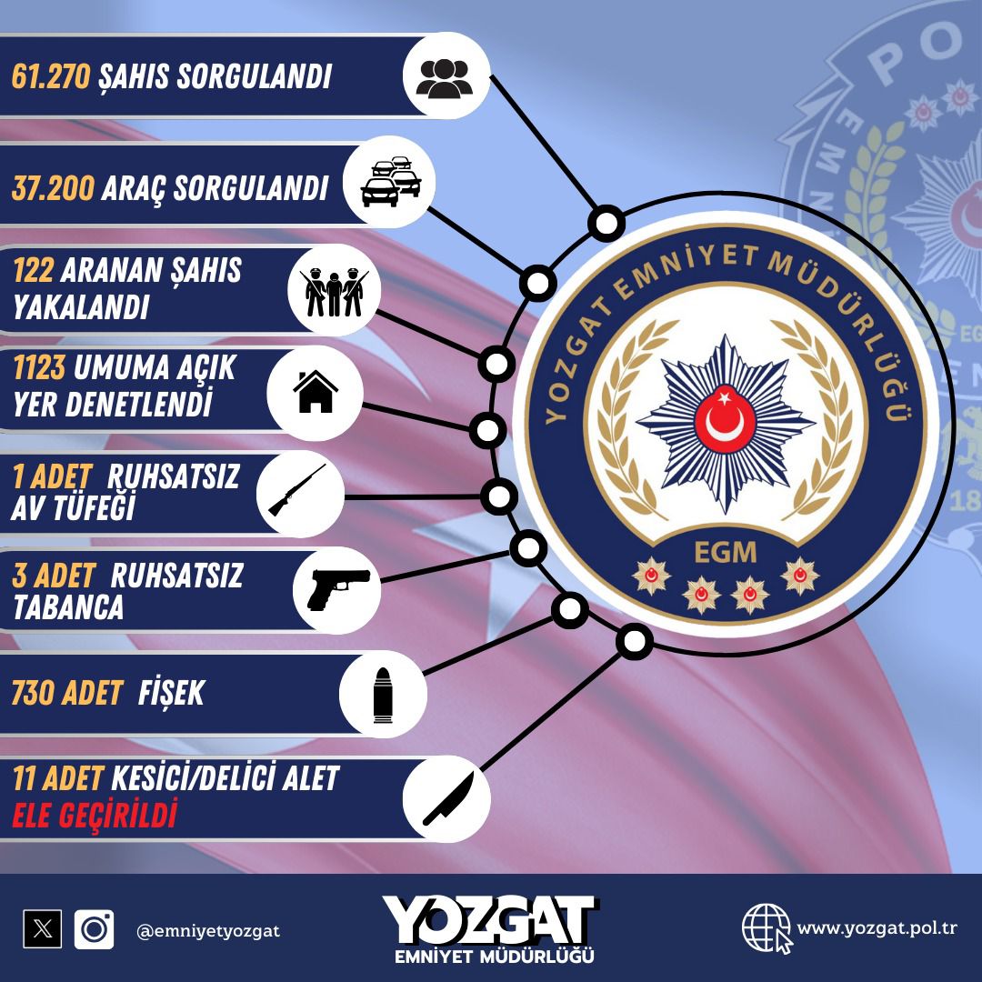 Emniyet Müdürlüğü, il genelinde 656 olayda 733 şüpheli şahıs yakalamış, 61.270 şahıs ve 37.200 araç sorgulamıştır. 5.307 araca cezai işlem uygulanmış ve 328 araç trafikten men edilmiştir. Ayrıca, çeşitli suçlardan aranan 122 şahıs yakalanmıştır.