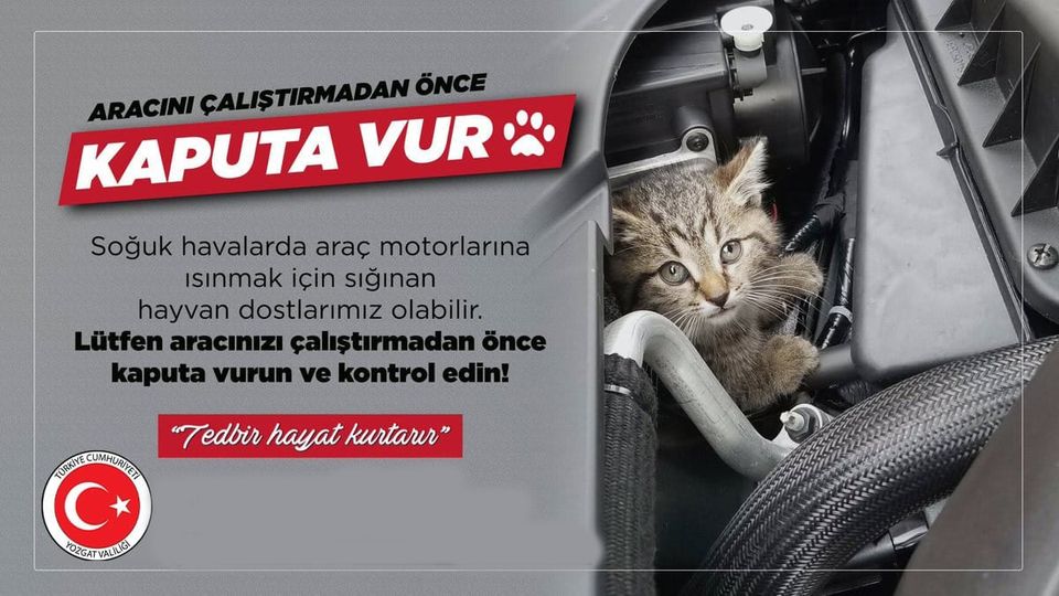 Soğuk hava şartlarında soğuktan korunmak adına sokak hayvanlarının araç kaputu içine girebileceğine dikkat çeken paylaşımda, araçların çalıştırmadan kaput içinin kontrol edilmesi dikkat çekti. / Yusuf BAĞCI