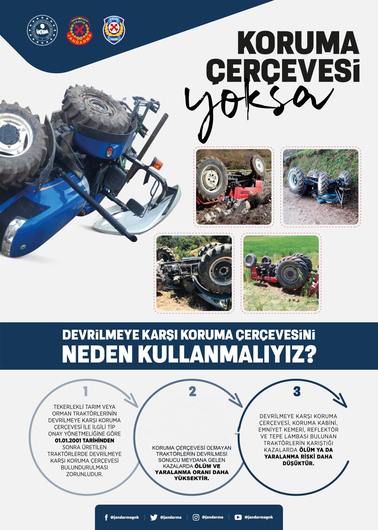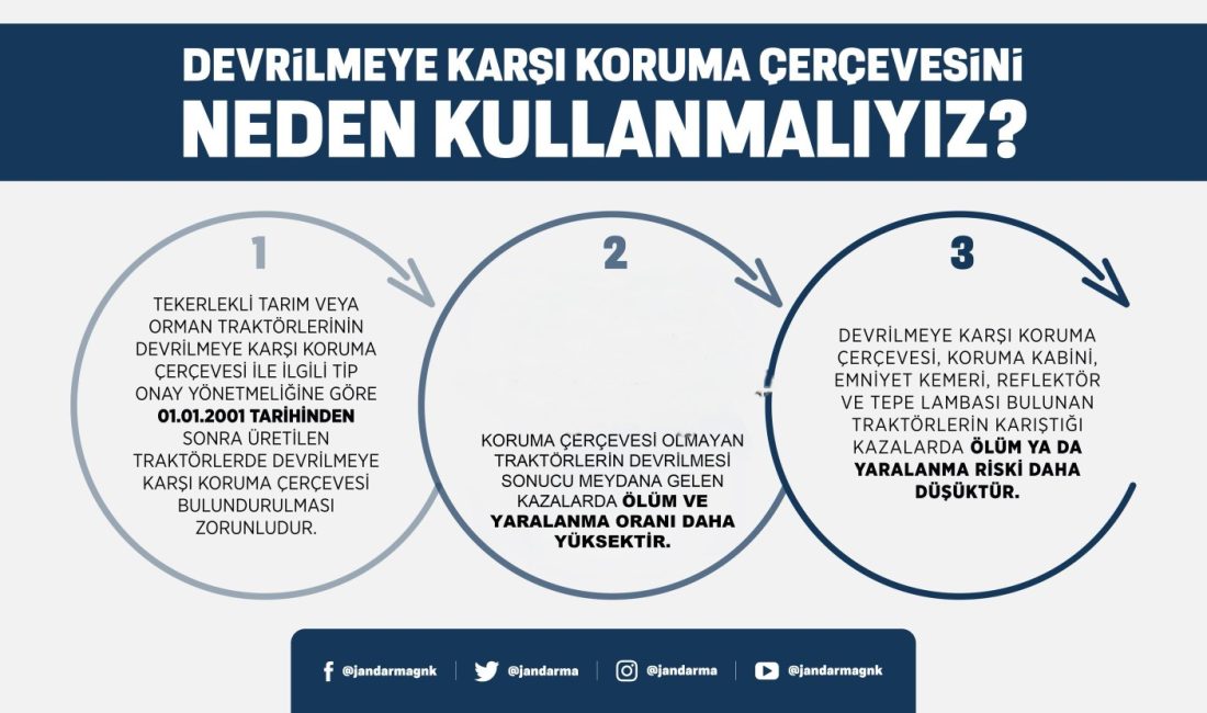 Paylaşımda, devrilmeye karşı koruyucu ROPS demiri ve kabin kullanımının hayati önem taşıdığı vurgulandı. Ayrıca traktörlere dönerli flaşörlü sarı uyarı lambası ve römorklara reflektör takılması gerektiği hatırlatıldı.