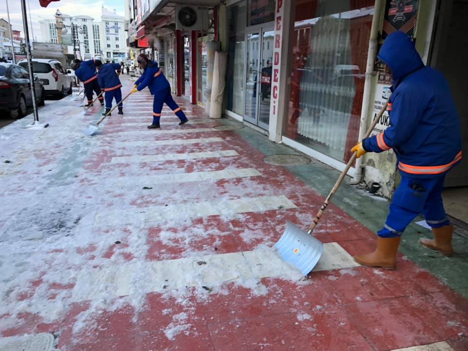Karayolları ve Belediye karla mücadele ekipleri, yollarda ve kaldırımlarda  kar kürüme ve tuzlama çalışması yaptı.