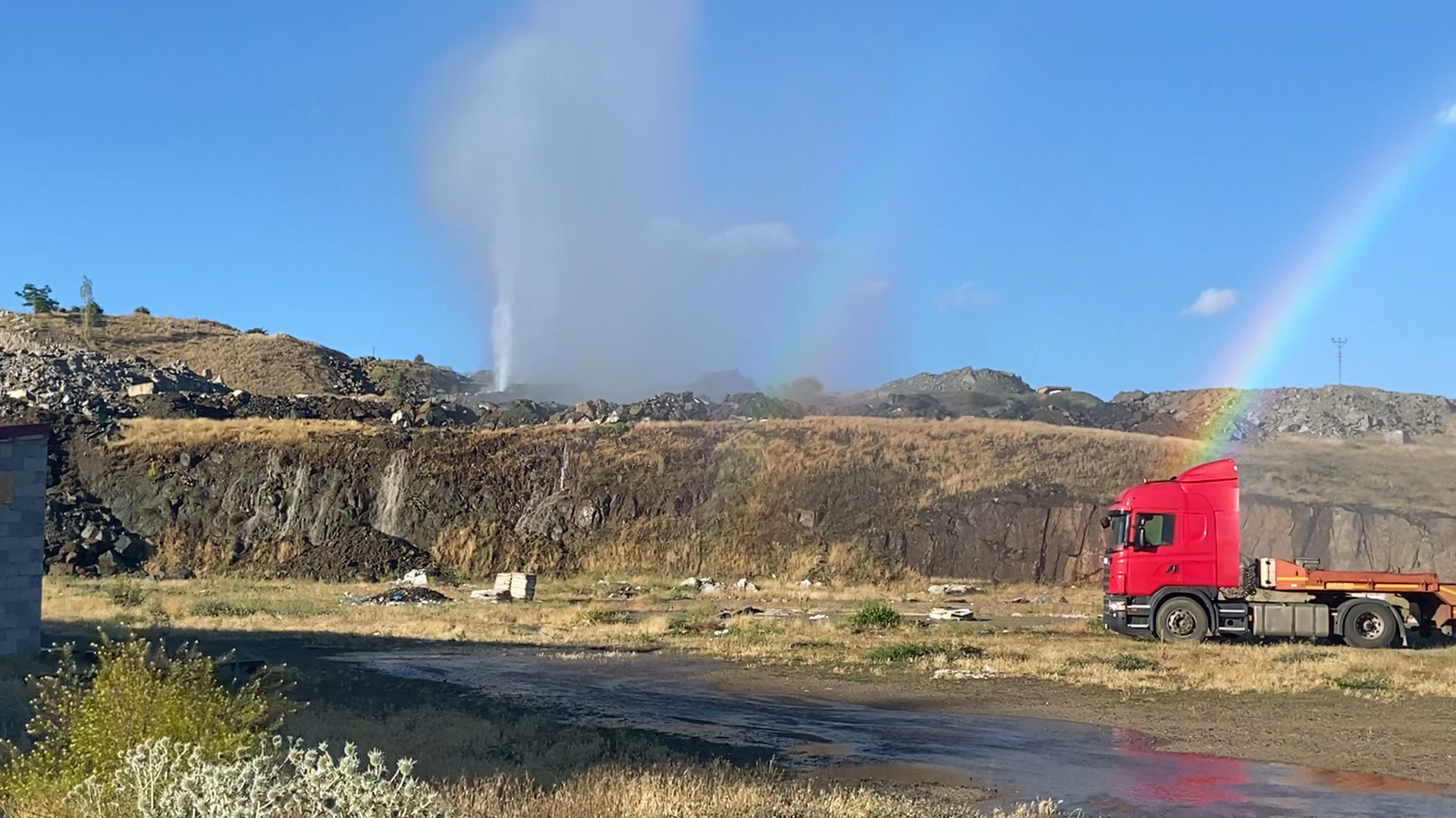 İnşaat alanında çalışan bir iş makinası, şehir şebeke suyu isale hattının ana borusuna zarar vererek patlamasına sebep oldu. Patlamanın etkisiyle su, yaklaşık 20 metre yüksekliğe fışkırdı ve çevrede ilginç bir manzara oluşturarak gökkuşağı oluşumuna neden oldu. Olay yerine gelen vatandaşlar, bu doğal görsel karşısında fotoğraf çektirdi.