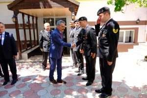 Vali Mehmet Ali Özkan, “Bugünlere gelmemizde emeği olan şehitlerimizi, gazilerimizi rahmet ve minnette anıyoruz. Geçtiğimiz yüzyılın başında Büyük Önder rahmetli Atatürk’le çıktığımız yolda yüzyılın başında Büyük Önder rahmetli Atatürk’le çıktığımız yolda yüzyılı tamamladığımız bu günlerde Sayın Cumhurbaşkanımızın kıymetli himayelerin de yolumuza söz yerindeyse dünya üzerinde adaletin, merhametin temsili temsilcisi olmaya devam ediyoruz. Ülke coğrafyamızda hizmetlerle, ülke coğrafyamızda gelişme, ülke coğrafyamızda hizmetlerle ülke coğrafyamızda gelişmeye, ülke coğrafyamızda değişmeyle yol alırken komşu coğrafyalarda da mazlumun, masumun, garibin, garibanın niyetimin söz yerindeyse dünya üzerindeki adaletin ümidi olmaya devam ediyoruz. Tabii maziden bugüne bugünden geleceğe yol yürüdüğümüz bu coğrafyada geçmişten günümüze aramızdan ayrılan şehitlerimize şühedaya karışan yiğitlerimiz oluyor. Elbette canlarımız onlar için yanıyor. Elbette gözyaşlarımız onlar için akıyor. Ama Allah’ın izniyle Türk milleti Yüce Türk Devleti’nin himayesinde şehitlerimizin huzurunda ve onların yolunda birlikte yol yürümeye devam ediyor. Zaman zaman sıkıntılarımız evet elbette zaman zaman dertlerimiz oluyor. Anadolu koskoca bir coğrafya, koskoca bir ocak. Ama bu ocağın dumanı, bu ocağın ateşi hep tütmeye devam ediyor. Arkadan yiğitlerimiz, arkadan erlerimiz, arkadan erenlerimiz geliyor. Elbette acılarımız oluyor. Geçtiğimiz yıl altı Şubat depremlerinde binlerce canımızı kaybettik. Yine hudut boylarında verdiğimiz mücadelede yiğitlerimizi şühedaya emanet ettik. Yine bugün Suriye’de Irak’ta Libya’da Karabağ’da millet olarak devlet olarak Sayın Cumhurbaşkanımızın himayesinde mazlumun, masumun yanında olmaya devam ediyoruz. Eksiğimizi gidermeye, azımızı çoğaltmaya, hep birlikte oldukça atiye doğru gururla yol yürümeye imanımızla, izanımızla, gücümüzle yeter. Allah milletimizi, Allah devletimizi var etsin. Bu vesileyle vesileyle ben başta rahmetli Atatürk olmak üzere bütün şehitlerimizi, gazilerimizi rahmet ve minnetle yad ediyor. Bugünlerde emeği olan bütün vatan evlerini selamlıyor. Gerek aklı, gerek ilmi, gerekse bedeniyle ülkesine hizmet etmekte olan bütün dostlarımıza, arkadaşlarımıza şükranlarımızı sunuyor. İlimizin, ülkemizin ve de tüm İslam aleminin bayramını kutluyorum. Bayramımız mübarek olsun.”diye konuştu.