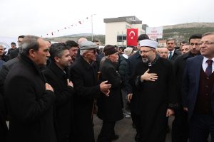 Başkan Erbaş, “ Peygamber Efendimiz (s.a.s.) Mekke’den Medine’ye hicret ettiğinde ilk olarak Mescid-i Nebevi’yi inşa etti. Medine’den sonra Ashab-ı kiram gittikleri her yerde camiler, mescitler inşa ettiler. Camilerin duvarlarını inşa ettikleri gibi içinde de eğitim yaparak, ilim, irfan, bilgi, hikmet merkezi haline getirerek, medrese talimi yaparak içini ihya etti. İnşallah bizler de Peygamber varisleri olarak, müftümüz, hocalarımız, vaizlerimiz, imamlarımız hem burada yapılacak olan camide hem de bütün camilerimizde cami dersleriyle, Kur’an, ilmihal, tefsir, hadis, fıkıh dersleriyle camilerimizin içini ihya etmenin gayreti içerisinde olacağız.”diye konuştu.