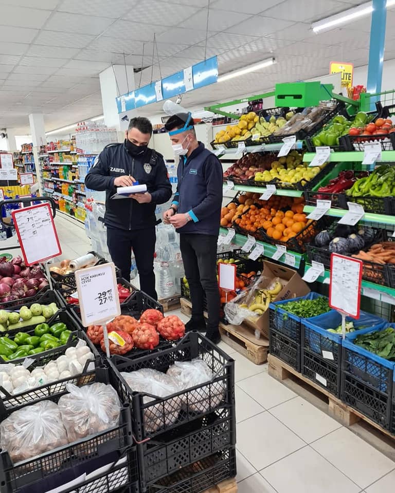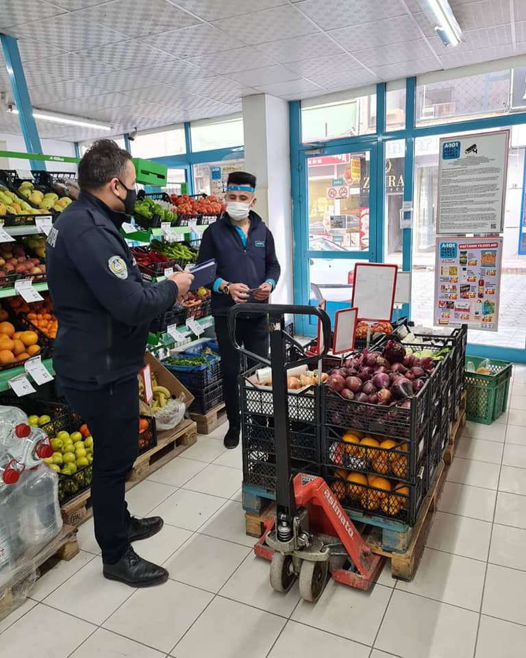 Zabıta ekipleri ilçede bulunan marketler, manavlar, kasaplar ve kuruyemişçi esnafını denetleyerek maske, mesafe ve hijyen konusunda uyardı.